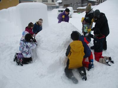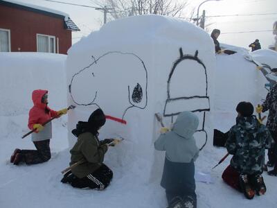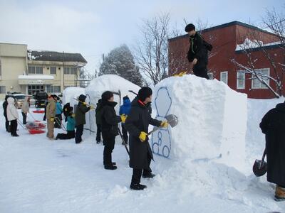先週の土曜日に、地域の方で雪ん子広場に向けての準備をしました。板やテントを運んだり、雪像の土台となる板を組み合わせたりしました。子どもたちの雪像の準備をしていただけるということで、ほとんどの先生方が参加しました。早速、今週から、雪像づくりが始まりました。スプレー缶で輪郭をかいて、だいたいの形を整えながら進めていきます。外での作業で寒くなると、公民館で温かい飲み物が飲めます。本当にありがたいです。子どもたちは、楽しみながら作業を進めているところです。出来上がるのが楽しみです。心配なのは、今週末の天候です。晴れてくれますように。